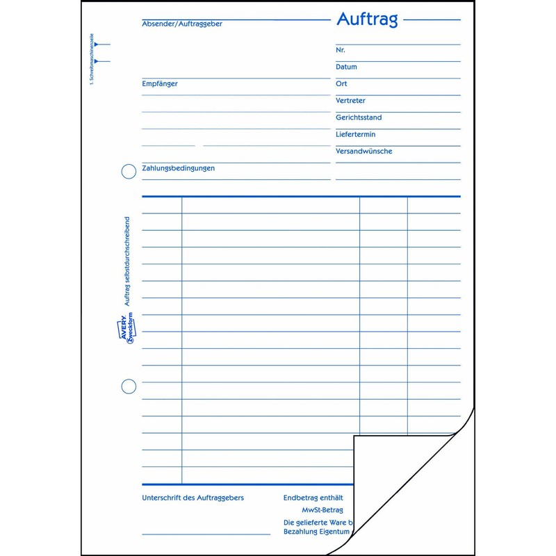 • Auftragsbuch mit einem Blatt Blaupapier und mit jeweils einem weißen Durchschlag - 1. Blatt bedruckt, 2. Blatt blanko zum Verbleib im Buch