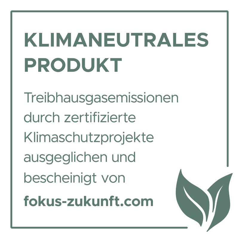 - Climate neutral product/created in Germany: developed and manufactured in Germany - greenhouse gas emissions of the product material and manufacturing process compensated by certified climate protection projects