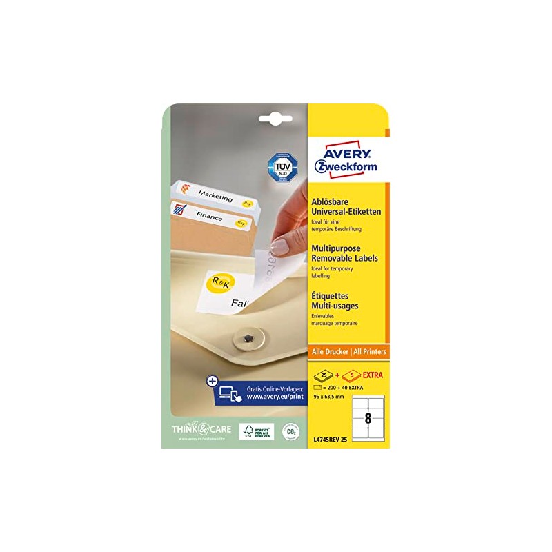 Sie können Ihre Etiketten individuell online bedrucken oder mit der Hand beschriften. Die ablösbaren Etiketten können auf allen gängigen Farb-/Laserdruckern, Inkjet Druckern und Farb-/Kopierern bedruckt werden, für Laserdrucker wurde der problemlose Etikettendruck sogar vom TÜV SÜD getestet und bestätigt. AVERY Zweckform stellt die lang bewährte Top-Qualität der Etiketten regelmäßig durch Tests in Prüflaboren sicher.