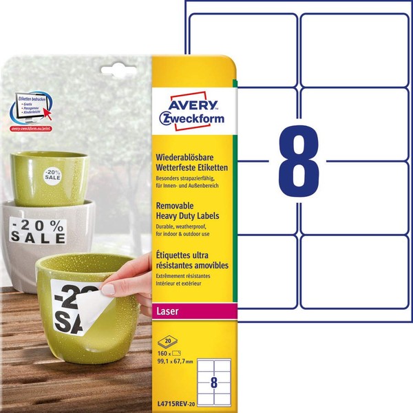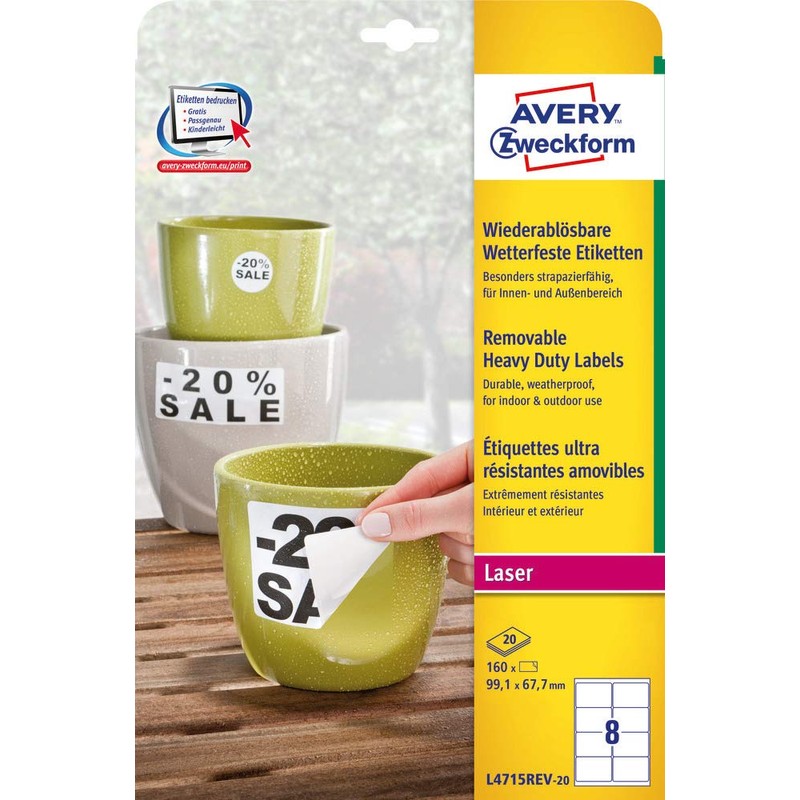 Avery Zweckform L4715REV-20 A4 Waterproof Labels, 160 Pieces, Removable, 99,1 x 67,7 mm, 20 Sheets White