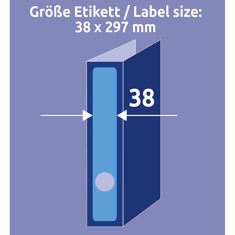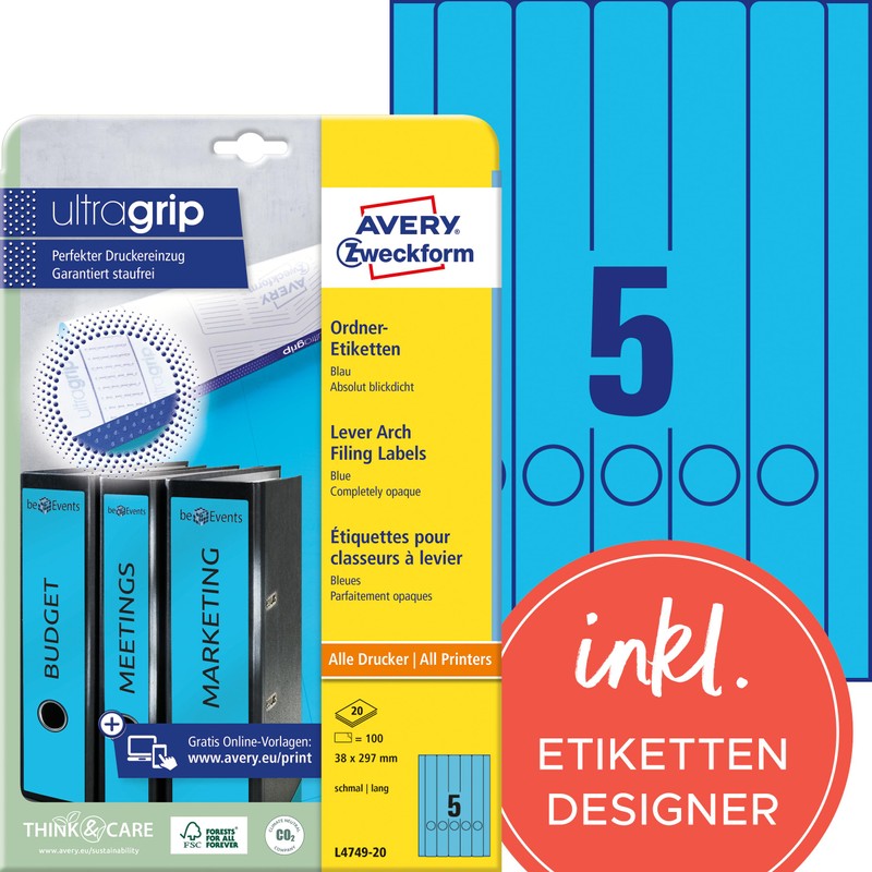AVERY Zweckform L4749-20 Ordnerrücken Etiketten (100 Rückenschilder mit ultragrip, 38x297mm auf A4, schmal/lang, selbstklebend, absolut blickdicht, bedruckbare Ordneretiketten) 20 Blatt, blau