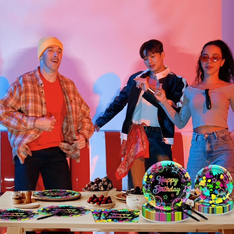 - Neon Birthday Party Supplies: Our glow neon birthday party set comes with 24 paper plates (9"), 24 paper plates (7"), 24 napkins, 24 forks; These tableware kit allow you to serve 24 guests on a happy birthday party