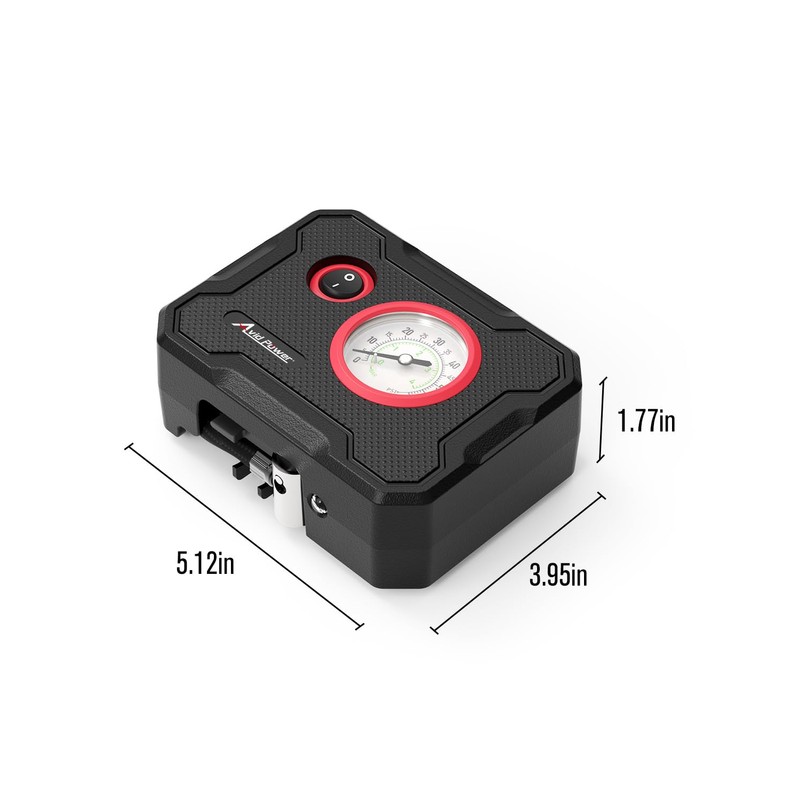 - [All-in-One Portable Design] This 12V air compressor features a compact hand-sized and box-shaped build, measuring 5.12*3.95*1.77 inches and weighing just 0.8 lbs—ideal as a space-saving companion for on-the-go use. Easily storable in your car for emergencies, it keeps the 12V cord, air hose, and adapters neatly organized