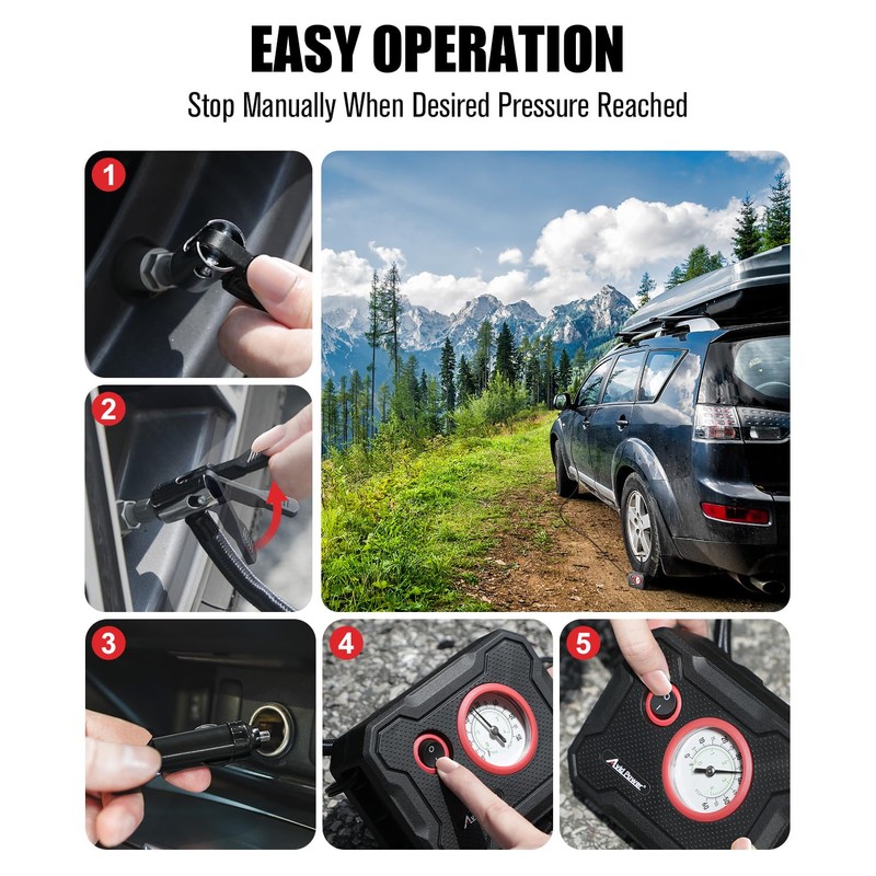 - [Quick connect air hose design] The air inflator features a quick-connect air hose: connect to the tire valve with the lever pushed down, then pull up to lock and check pressure