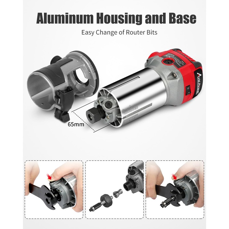 AVID POWER 6.5 Amp 1.25 HP Compact Router Tools for Woodworking, Fixed Base Wood Router with Trim Router Bits, 6 Variable Speeds, Edge Guide, Roller Guide, Dust Hood (Red, 65mm)