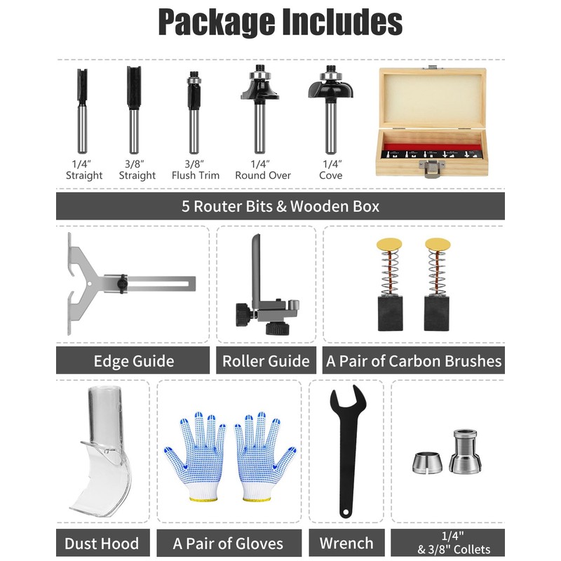 - Package Included - 1.25 HP compact router tool with 12.1Ft/3.7m cord, 5 router bits, edge guide, roller guide, dust hood, 3/8” and 1/4” collet, wrench and tool bag.