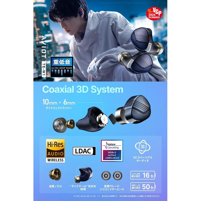 AVIOT TE-W1 Adaptive Hybrid Noise Cancelling Wireless Earphones, Coaxial 3D System, High Resolution Compatible, Earphones, Dual Dynamic Driver, Metal Nozzle, Multi-Point Support, Up to 50 Hours