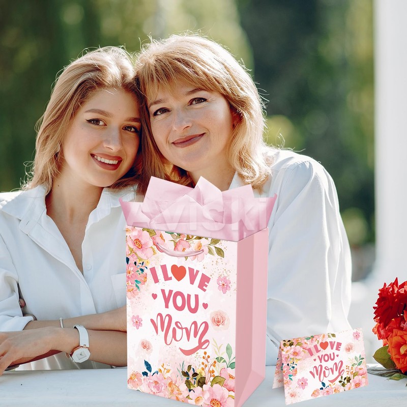 - PERFECT SIZE AND PACKAGE CONTENTS - Each mothers day paper gift bag measures 33×26×12.5 cm/13 x 10.2 x 4.9 in, and has a 9-10 cm handle. They are proper in size and can hold items such as candies, biscuits, chocolates, cards, toys, and other gifts etc. Very suitable for gift packaging. This set includes 1 gift bag, 2 pcs of pink tissue paper and 1 lovely greeting card.