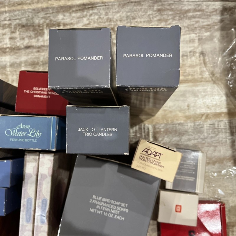 Big lot of Avon new/old stock. Wallets, sachet, bags, ornament, cassette tape, perfume bottle etc. unsure if make up is still good