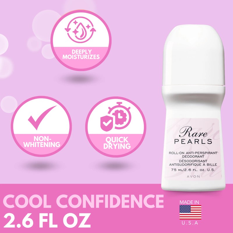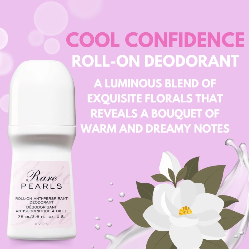 Experience everyday elegance with Avon Rare Pearl Roll-On Antiperspirant Deodorant. Inspired by the soft sophistication of the Rare Pearl fragrance, this deodorant brings a touch of refined floral scent to your daily routine.