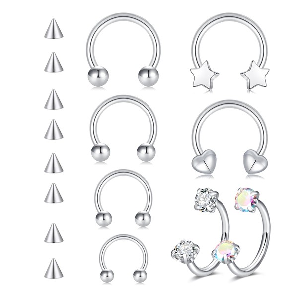 - 8 unique nose rings + 8 balls – versatile set with 8 septum rings (6/8/10/12 mm diameter) and 8 replacement balls in star, heart, zirconia and ball designs.