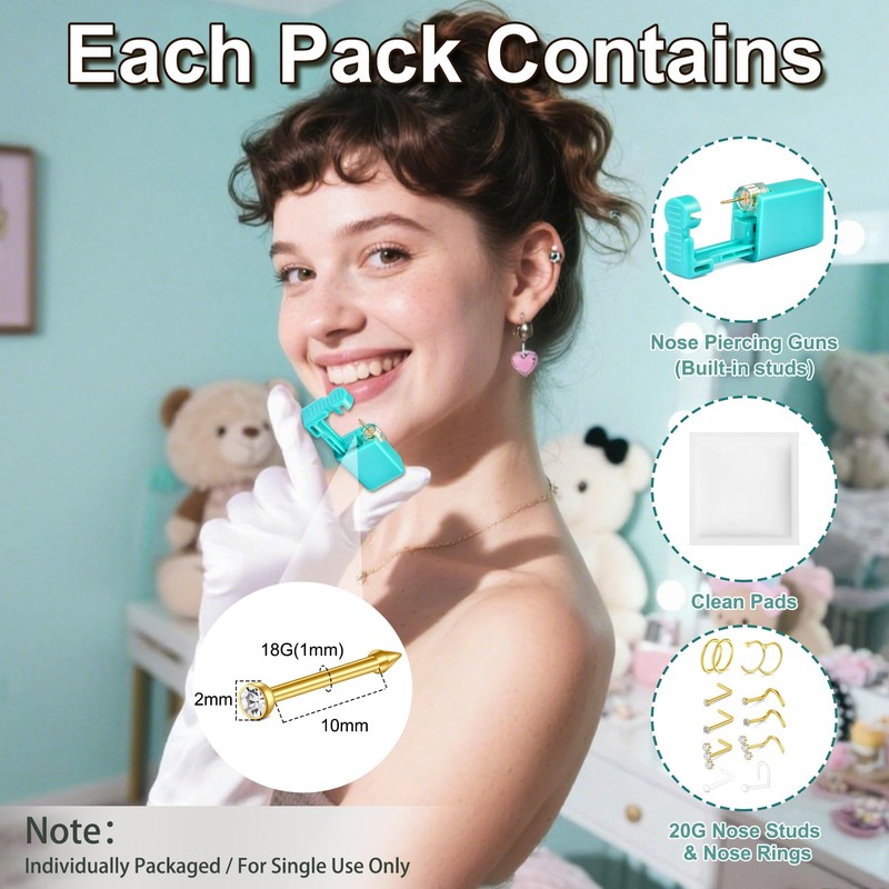 - Disposable nose piercing set - Each nose piercing gun is individually packaged and made of 316L stainless steel (surgical steel) for a worry-free piercing process. Piercing yourself at home with ease and confidence.