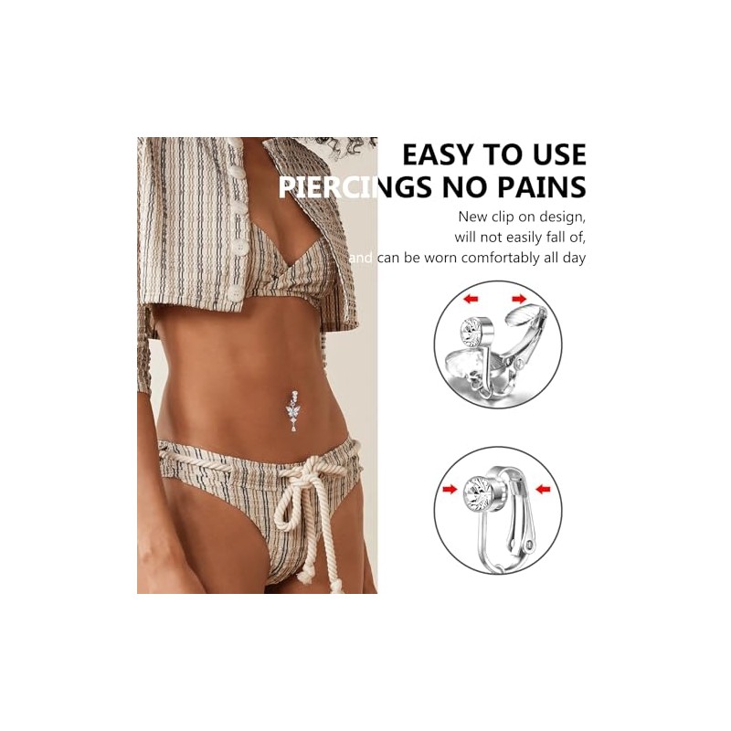 - PAIN-FREE CLIP-ON DESIGN - These fake belly button rings feature an easy clip-on mechanism that requires no piercing. Perfect for women who want to try trendy navel jewelry without the commitment or pain of actual piercings.