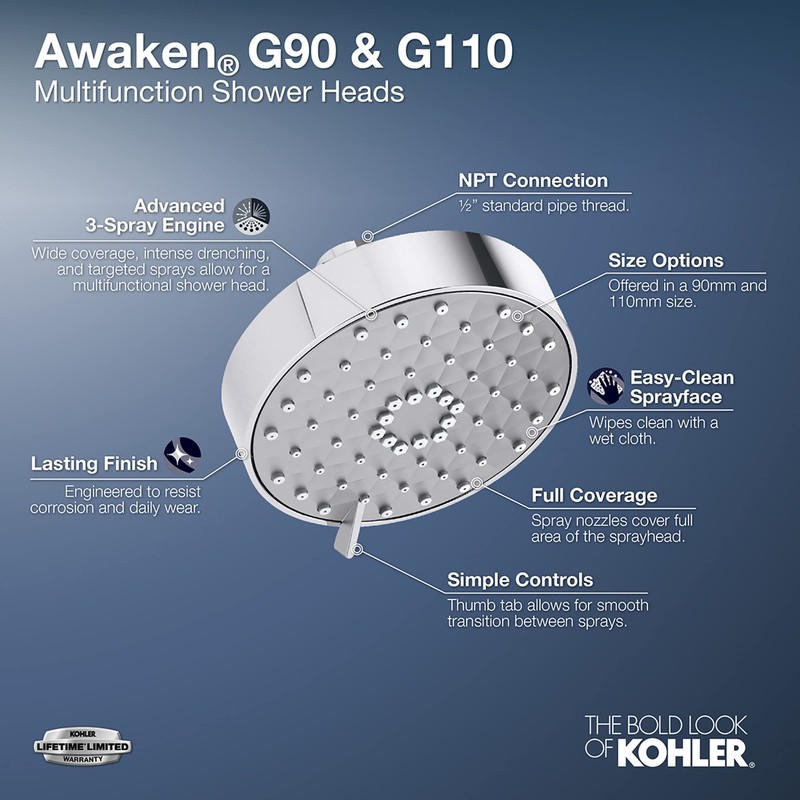 - Easy to Use, Easy to Clean: Kohler shower head features a thumb tab that allows you to transition between spray modes with ease; chrome showerhead comes with a finish that resists corrosion and tarnishing, and a MasterClean sprayface that is easy to cleanse, helping prevent mineral buildup