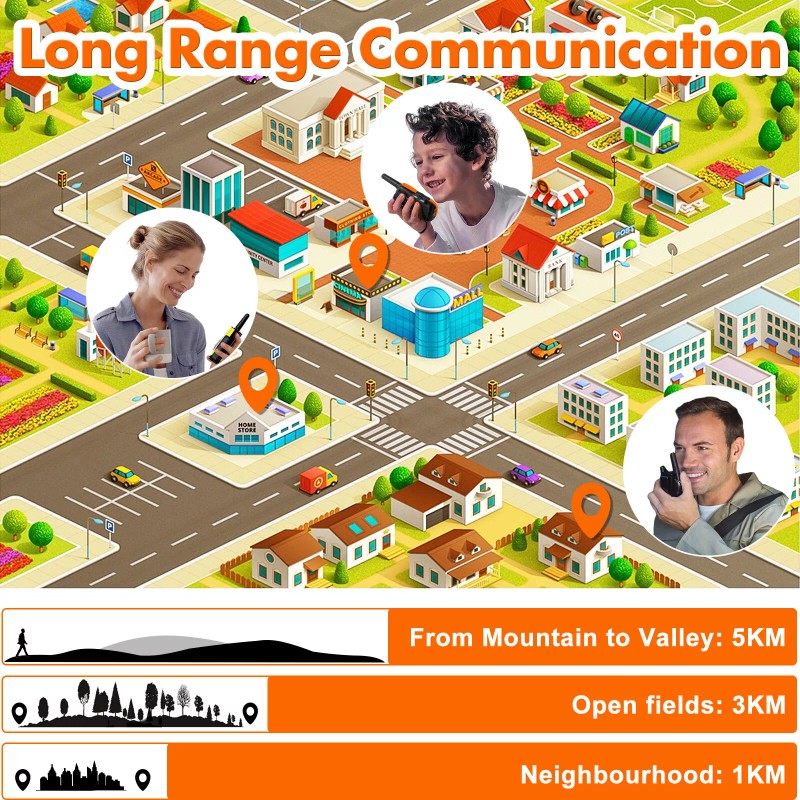 The pocket-sized rechargeable walkie talkies come with belt clips and lanyards, are very easy to set up with the help of a friendly user manual and are ideal for kids to use.