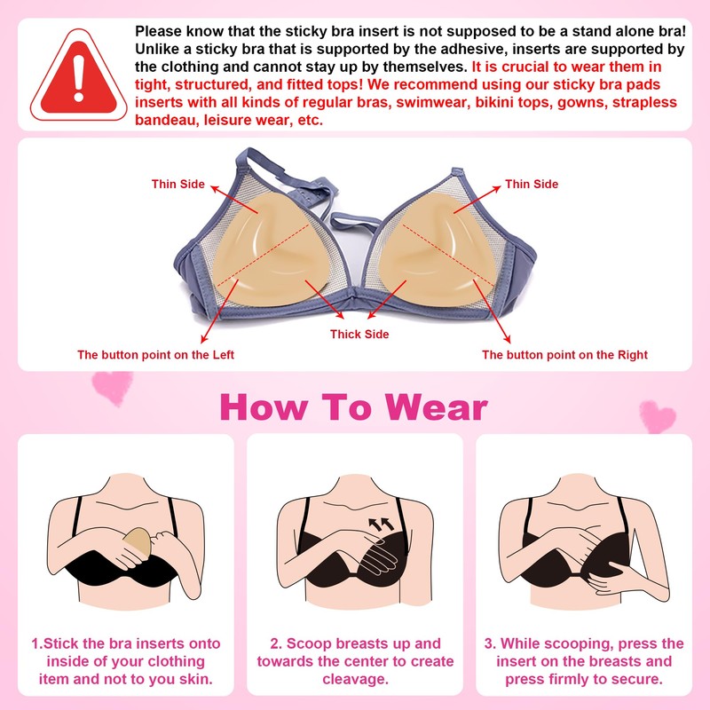 - The sticky bra inserts should not be seen as separate bras. We recommend using our sticky bra inserts with all kinds of regular bras. Perfect for backless/strapless dresses, t-shirts, halter tops, wedding gowns, sports bras, swimsuits etc. No sewing required and removable.Experience a noticeable boost in cup size and curves,and you'll absolutely love your new look!
