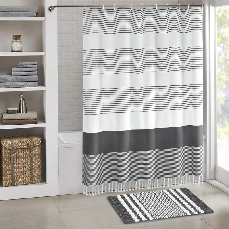 Awellife Dark Grey Bathroom Sets with Shower Curtain and Rugs 72" X 72" Stripe Tassel,Shower Curtain Sets with Rugs 32"x20" Extra Soft Absorbent Chenille