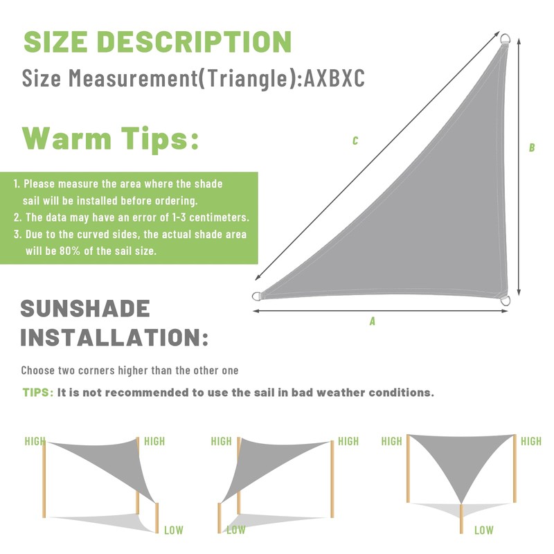 - WATER&SUN RESISTANT The triangular shade sail provides 95% UV protection and protects you from sunlight. The breathable material is sun and water resistant while keeping you cool. It is recommended to maintain an angle of about 20% during installation so that rainwater can drain quickly and does not accumulate.