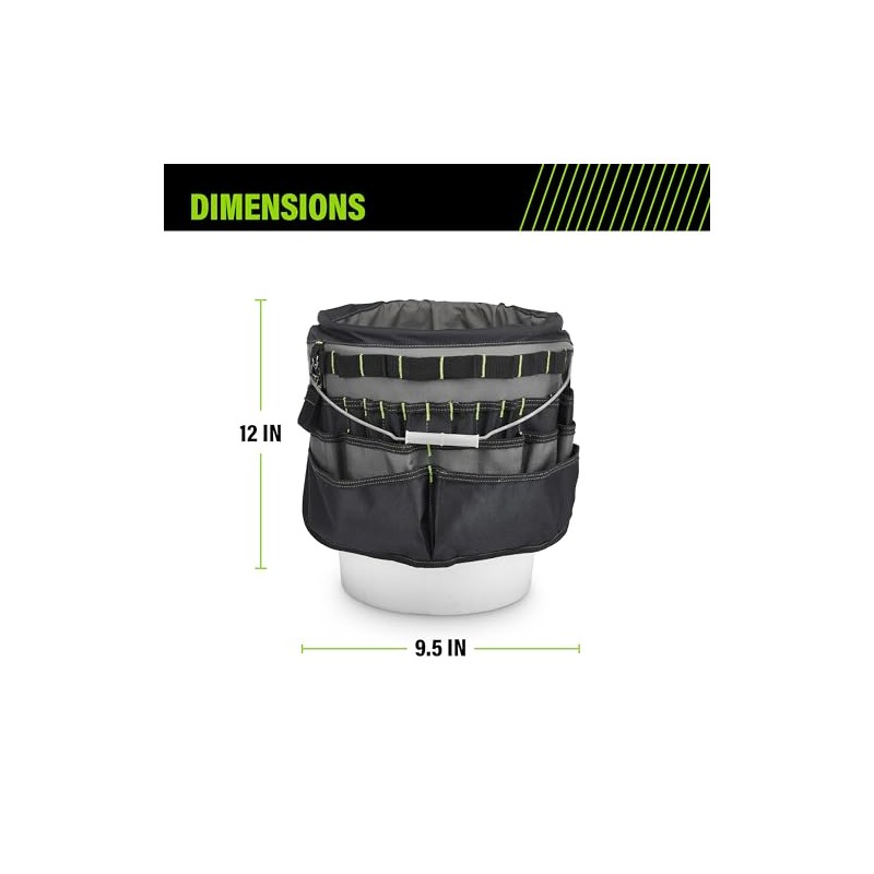 - PREMIUM TOOL ORGANIZER: Bring the shop to the jobsite with our exclusive Bucket Tool Organizer. Our durable and rugged 5-gallon tool bag was made to save you time and energy by keeping your tools organized and within quick reach.