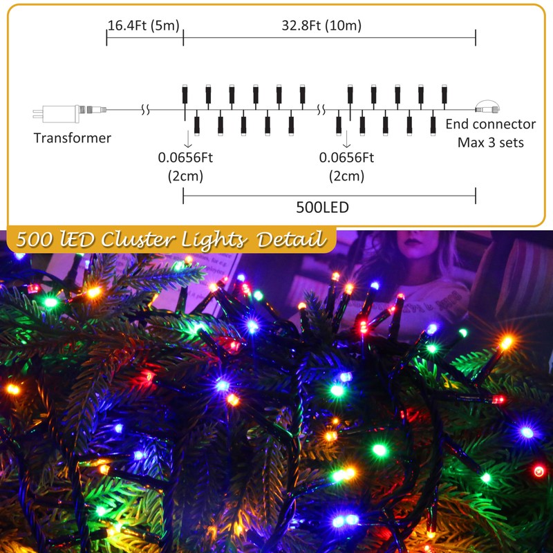 - 【 500 LED Cluster Lights】The 49 ft christmas cluster lights feature up to 500 LED lights. They offer three-types lighting and11 different modes and can be extended for more versatile decoration. Perfect for Christmas decor, they illuminate your home to enhance the festive atmosphere around your window, door, garden, and home.