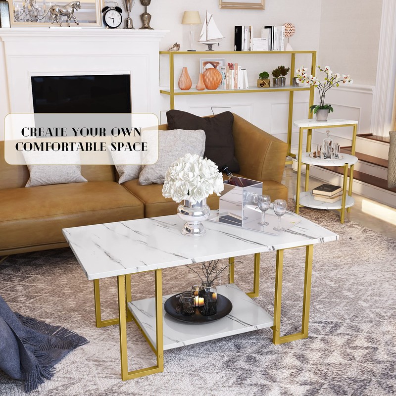 • 【Stylish White&Gold】Multi-Tier Design offer you ample space for storage,making your space in order. This Elegant Living room table set can easy blend with most decor ,whether traditional or modern,while maintaining a distinct style.
