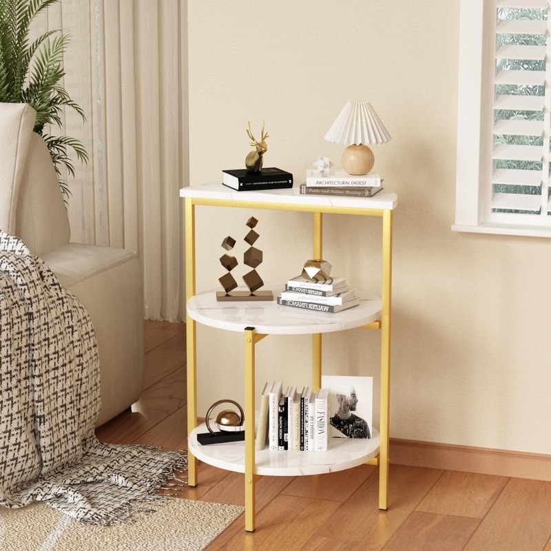 AWQM Marble Side End Table, 3-Tier Sofa Side Table,Small Round Coffee Table Bedside Table, Corner Table w/Metal Frame for Living Room Bedroom, White+Gold