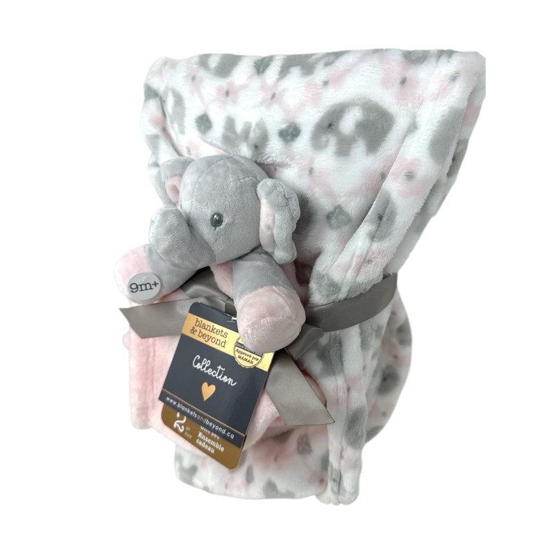 - Main blanket measures 28 inches x 32 inches and has a white & pink background with lucky elephants pattern