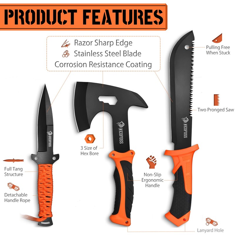 • 🏕 Great Value Of Money | Combo Includes: 1 piece 15” Brush Clearing machete knife with sheath, 1 piece 10” tactical axe with sheath, 1 piece 10” tactical knife with sheath, 1 piece knife stone sharpener.