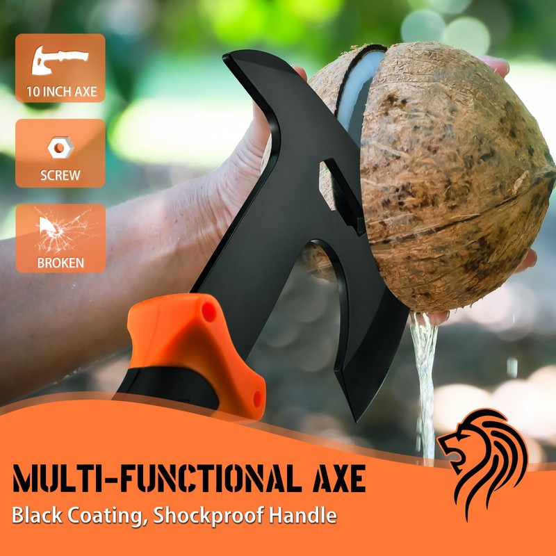 • 🏕10” Camping Axe And Hatchet With Shock Reduction Rubber Handle - Great for small jobs. It is good for splitting small firewood and and precise cuts. It's sharp, light weight, sturdy, compact axe to carry while hiking, backpacking and camping.