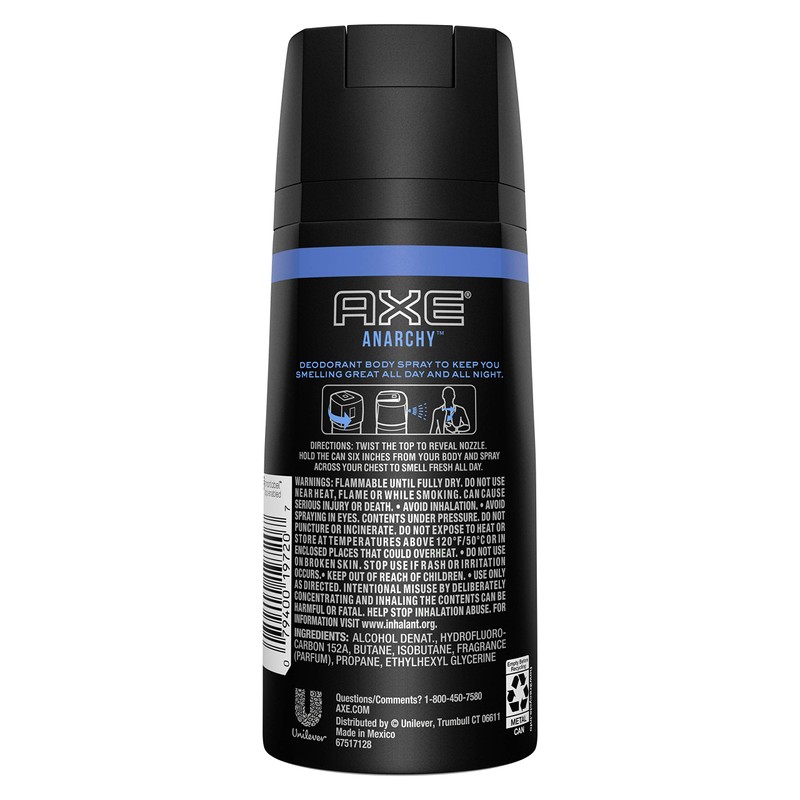 - AXE Body Spray for Men, Anarchy, 4 oz – A rich, spicy fragrance that combines fresh and fruity notes