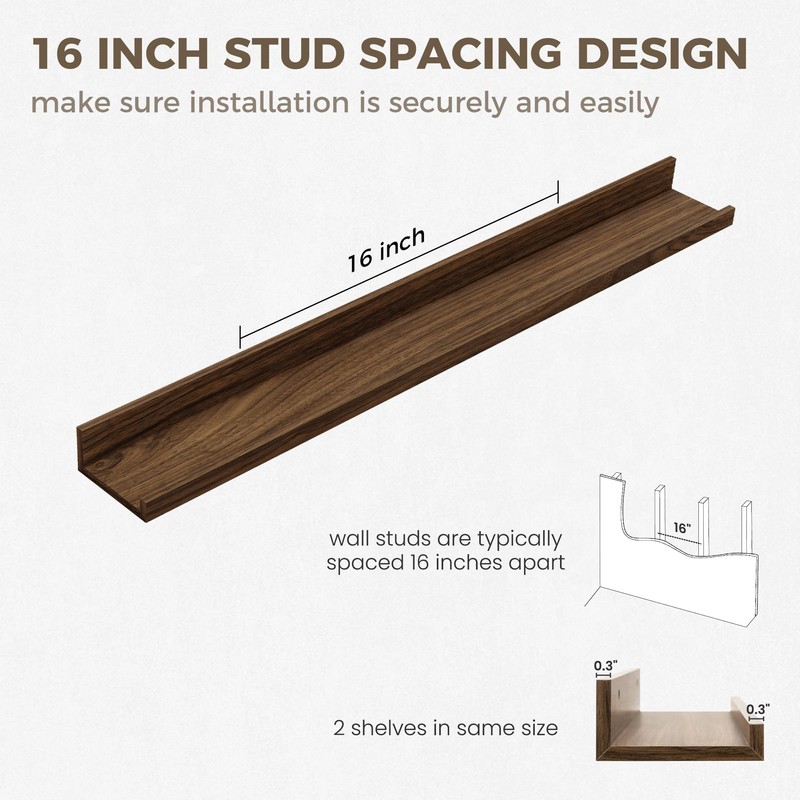 - 16-Inch Stud Spacing Design - Our picture shelf features pre-drilled holes conveniently spaced 16 inches apart to align with standard wall studs. This thoughtful design ensures a strong and secure mount, allowing you to confidently display your belongings while maximizing load-bearing capacity
