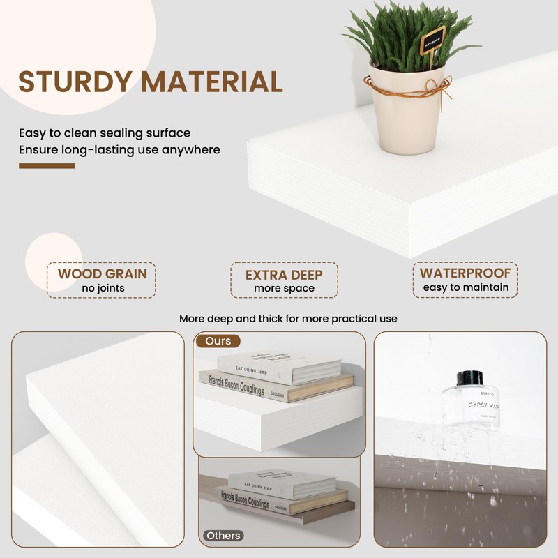 - Invisible Bracket for a Clean Look: Hidden steel brackets are used to firmly support the shelves without leaning or sagging for a true floating effect. The design provides a seamless, clutter-free appearance to enhance your toilet, desk, between windows, above fireplace or under TV.