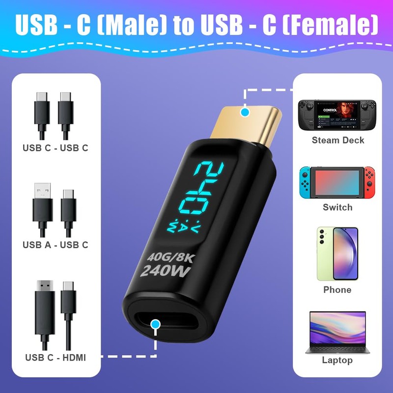 • 【240W Fast Charging & Data Transmission】Supports fast charging up to 240W. This USB-C adapter can charge quickly and supports 48V/5A current output. In addition, it also supports data transfer rates up to 40Gbps, enabling the transfer of large files in a short time. 8K ultra-high definition video data can be transmitted simultaneously to meet high-resolution video requirements (PS: data transmission speed depends on host and device support).