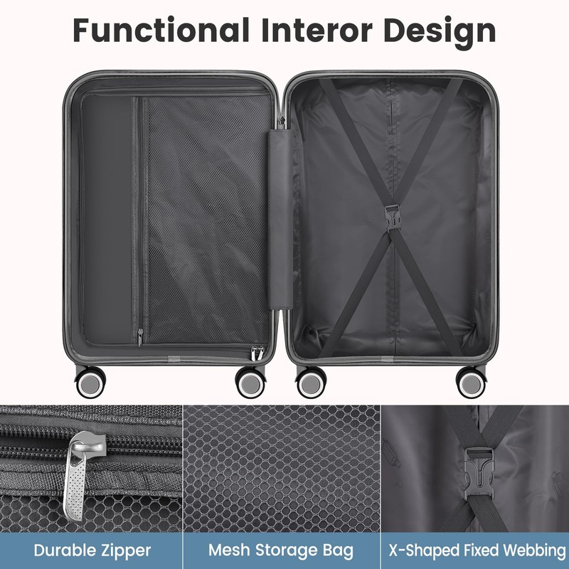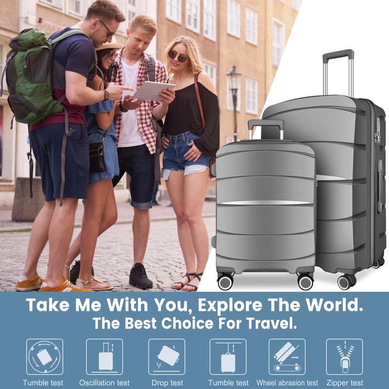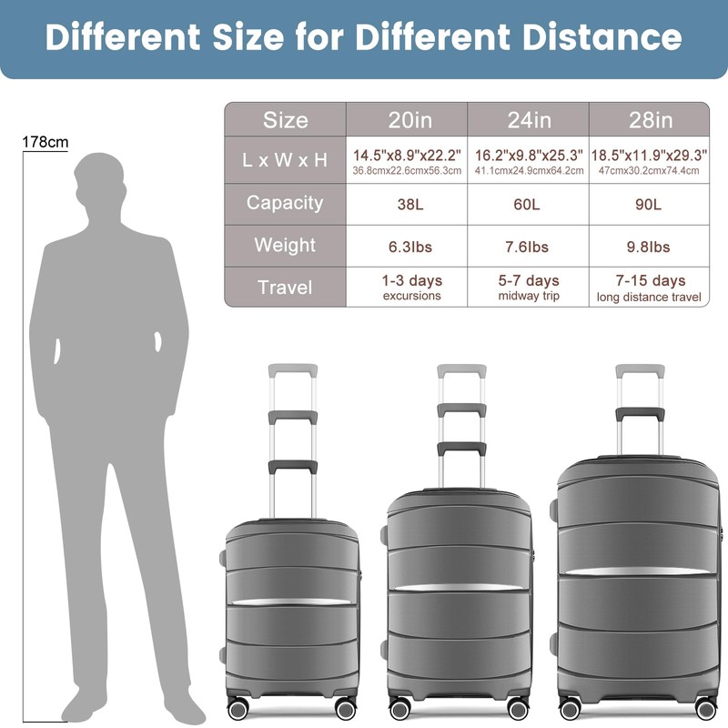 - PREMIUM MATERIAL: The luggage is made of PP (polypropylene) material, which is lighter, less dense, high strength (not easy to break, can withstand high impact), durable and odorless, with a textured surface to prevent scratches. 3 piece luggage sets includes: 20 in, 24 in, 28 in.