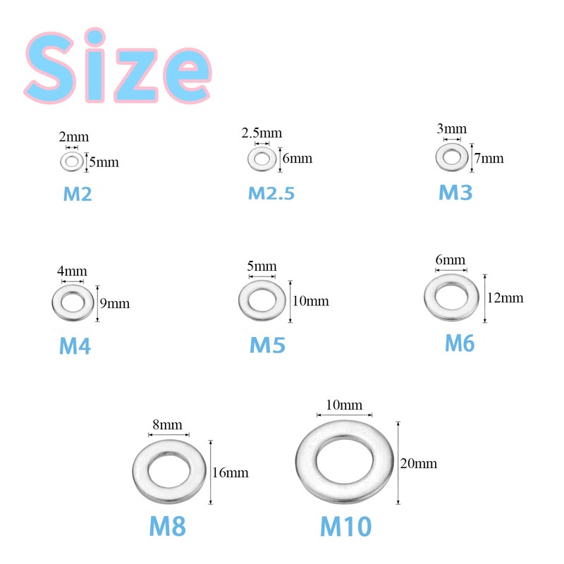 - Easy Storage: All the stainless steel flat washers are neatly packed in a sturdy transparent plastic case. The case features separate grids to distinguish the 9 different sizes. Each grid has a specification label, making it easy for you to find the washers you need. This clear and easy-to-use storage box ensures convenient organization and easy access to the washers whenever you need them.