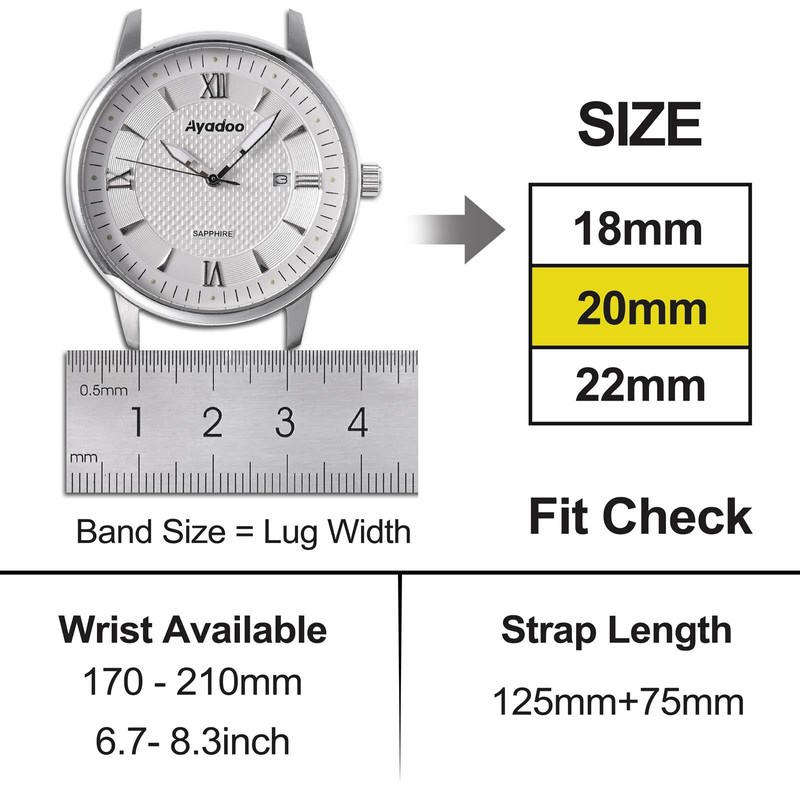 - Watch Band Length:This strap length is 75mm+125mm, fit the wrists from 170mm - 210mm (6.7”-8.2”).9 holes can be adjusted freely to fit your wrist.