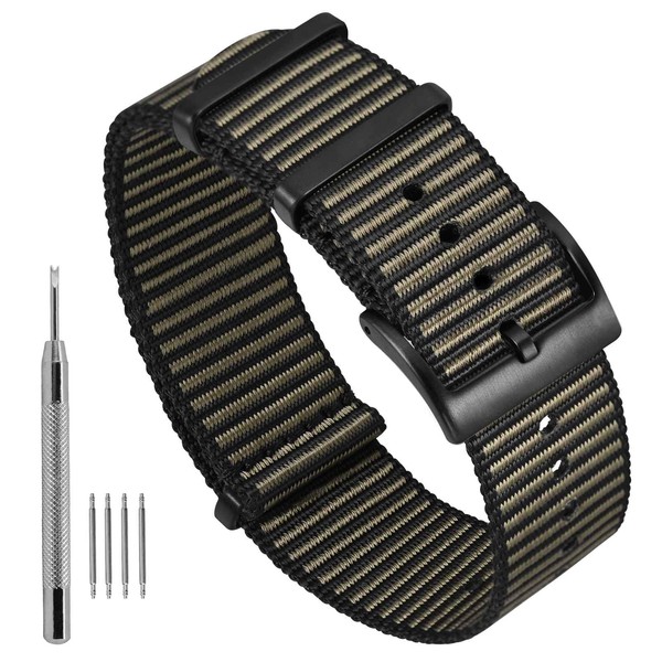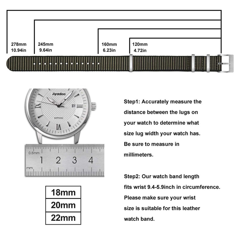 - [Durable Nylon Material] “Ayadoo” choose the Durable Nylon material to made this stripe pattern watch band. Breathable and Quick-drying materials ideal for camping, swimming and other aerobic activities. The watch has 13 holes and can be adjusted to the length that suits your wrist.