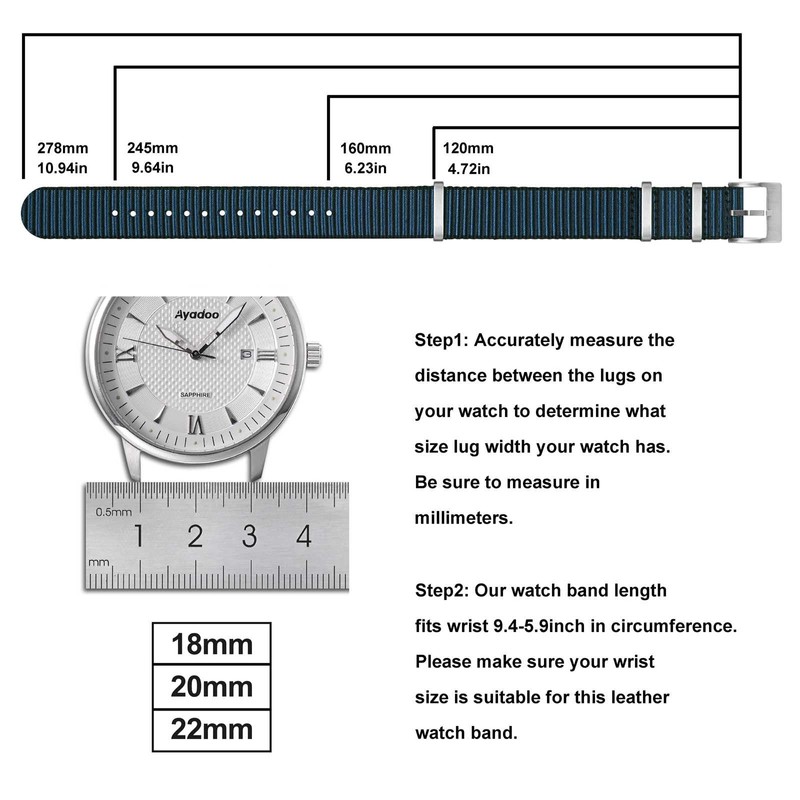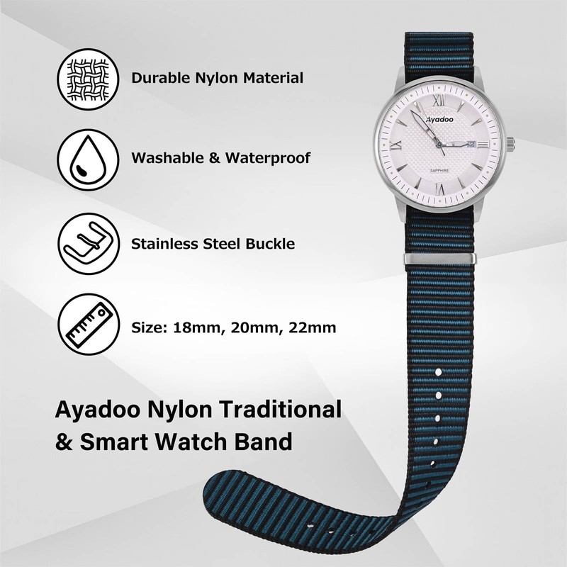- [Durable Nylon Material] “Ayadoo” choose the Durable Nylon material to made this stripe pattern watch band. Breathable and Quick-drying materials ideal for camping, swimming and other aerobic activities. The watch has 20 holes and can be adjusted to the length that suits your wrist.