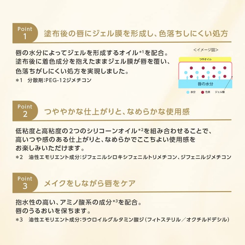 • -【Lip care while applying makeup】 Formulated with an amino acid based ingredients*, which has high water holding properties. It prevents dryness and keeps your lips moisturized, while keeping them dry. (*Oil-based emollient ingredient: diy lauroid glutamate (phitosteryl/occhylddexyl))