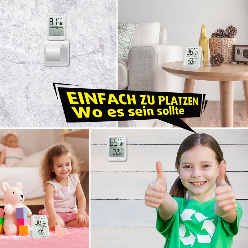 - This room thermometer for home comes with durable battery and power button. What's in the box: 6 x indoor thermometer, 6 x CR2032 battery, 12 x adhesive strips for wall. Worth every penny!