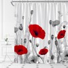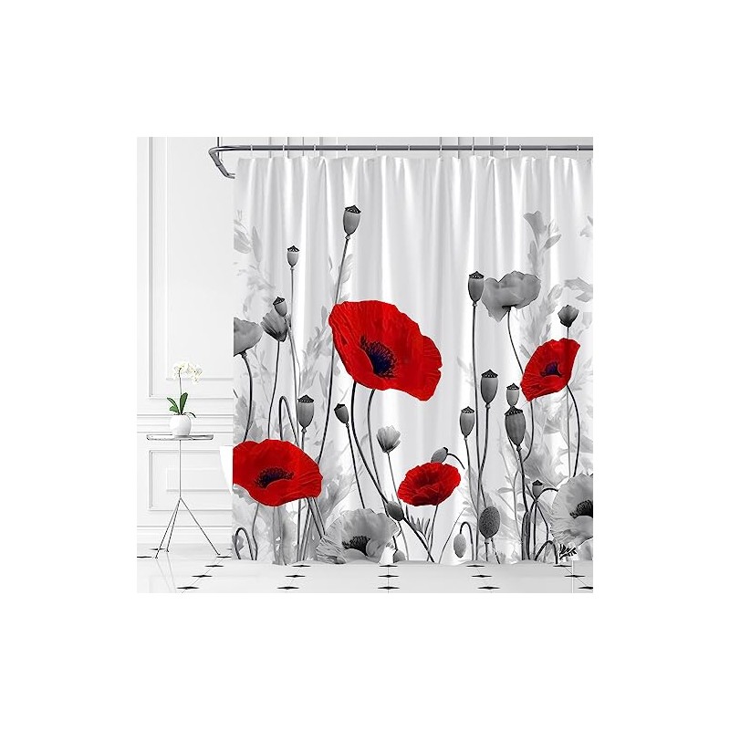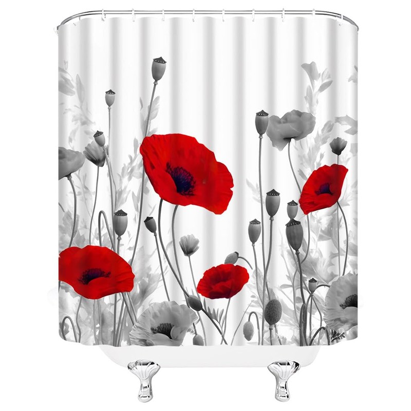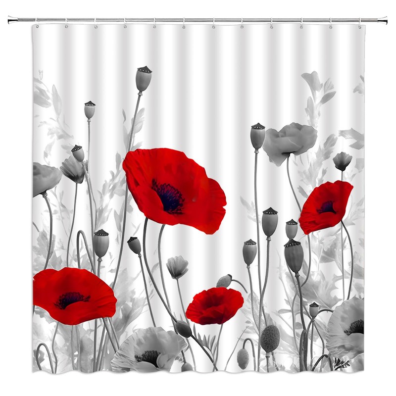 AYDSMYD Red Gray Floral Shower Curtain Elegance Black White Retro Poppy Abstract Flower Gray Plant Leaves Home Fabric Bathroom Decor Set Include Hooks,70" WX70 H