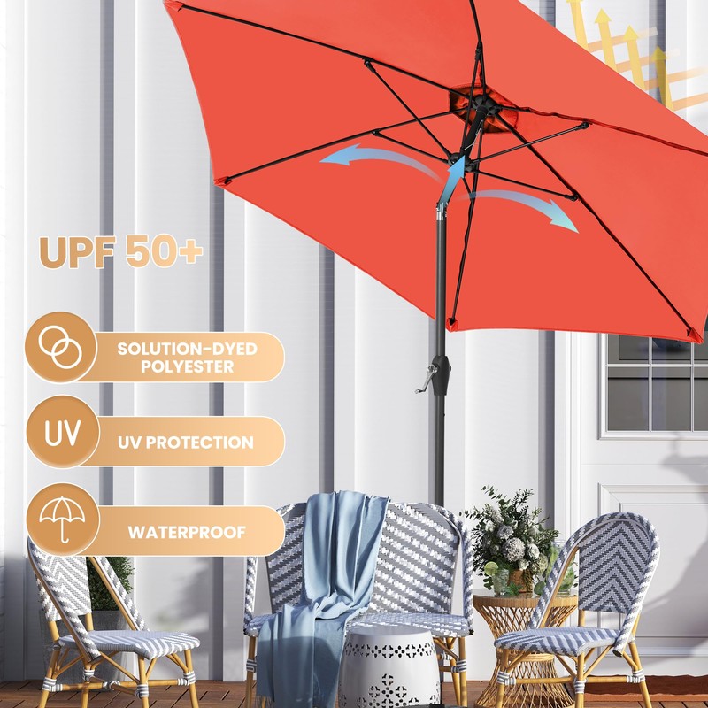 - 7.5FT LARGE CANOPY: This premium patio umbrella is equipped with a 180G 100% polyester canopy that's windproof, waterproof and fade-resistant, 97% UV protection, high-quality material can be used for many years. Air vented canopy at the top designed for air flow and prevent from inversion.