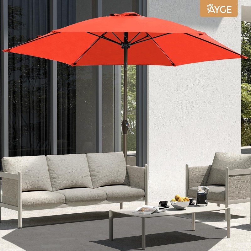 Our AYGE patio umbrella features fiberglass ribs, providing exceptional wind resistance and preventing breakage, making it your most reliable choice for outdoor use. The UPF 50+ fabric offers superior sun protection, effectively blocking over 99.9% of harmful UV rays, ensuring a safe and comfortable outdoor shelter. The high-density, waterproof, and UV-resistant fabric enhances its beauty and durability, making it the perfect addition to your garden, patio, or poolside.