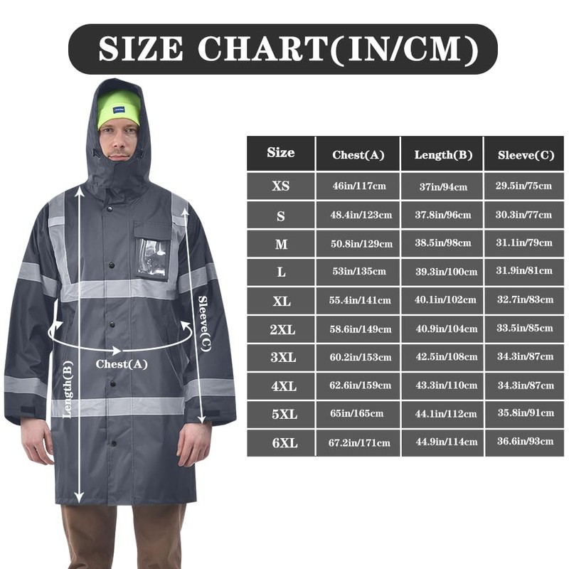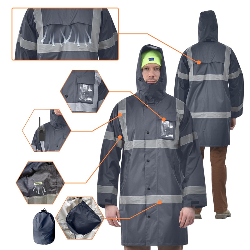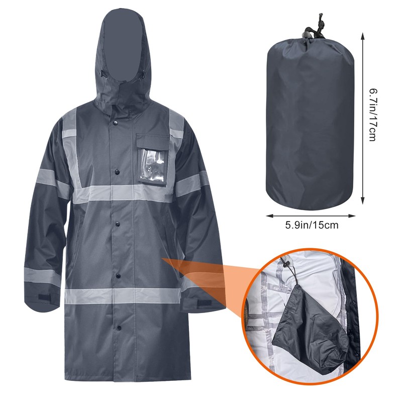 - [Standard]: Meets ANSI/ISEA 107 Type R Level 3 safety raincoat standard. The chest, shoulders, arms, and legs of the raincoat are made of highly reflective material, providing 360 degree protection and easy visibility in low or strong light.