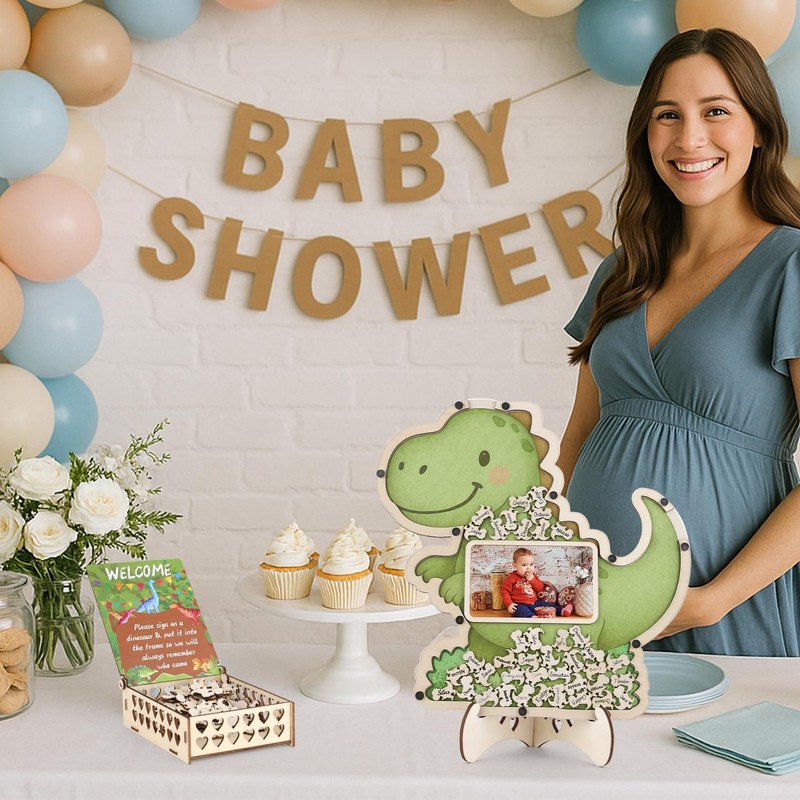 • Practical Dinosaur Guest Book Alternatives Set: The dinosaur baby shower decorations set contains 1 dinosaur themed wooden picture frame with display stand, 1 dinosaur themed wooden box, 50 pcs wooden dinosaur egg slices, the practical set can well meet your various demands