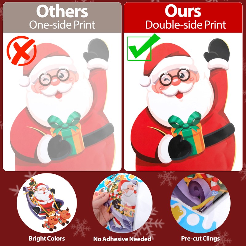 • DOUBLE SIDED These static Christmas window clings for glass windows are double sided printed, providing the same visual effects inside and outside windows. Neighbors outside can also appreciate the vibrant Christmas element patterns on the windows and feel more festive