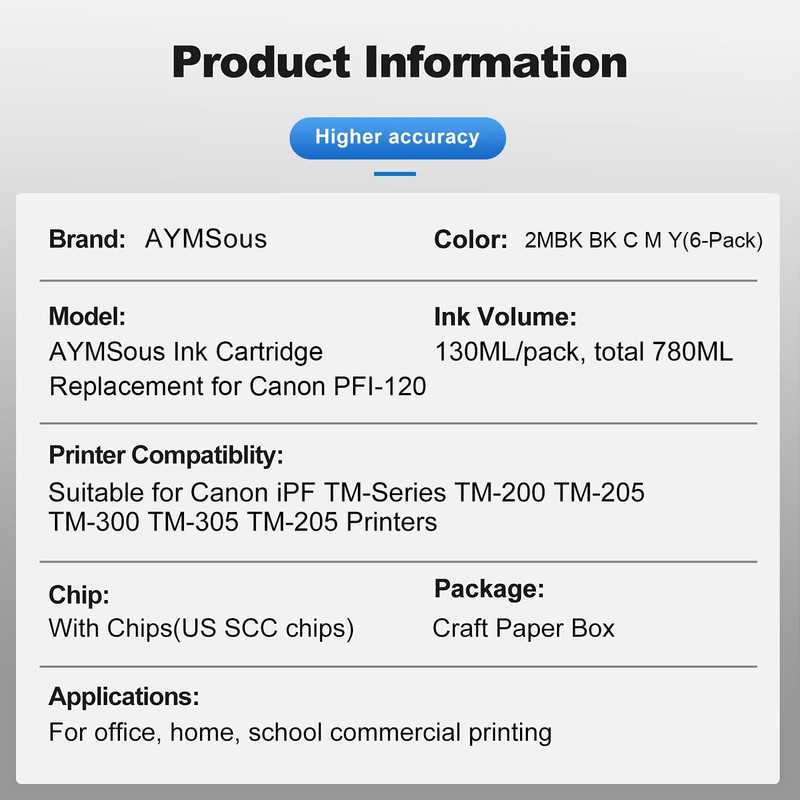AYMSous Compatible Ink Cartridge Replacement for Canon PFI-120 PFI 120 for Canon imagePROGRAF iPF TM-200 TM-300 TM-305 TM-205 (2 Matte Black, 1 Black, 1 Cyan, 1 Magenta, 1 Yellow, 6-Pack)