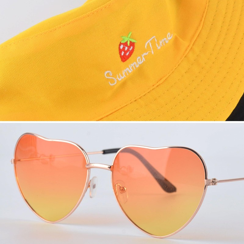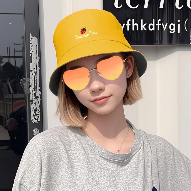 - STYLING: This unisex reversible bucket hat features a stylish strawberry embroidery design on one side and a solid colour on the other side, complete with different coloured sunglasses, it goes perfectly with casual summer outfits and is a stylish accessory for beach trips or outdoor adventures.