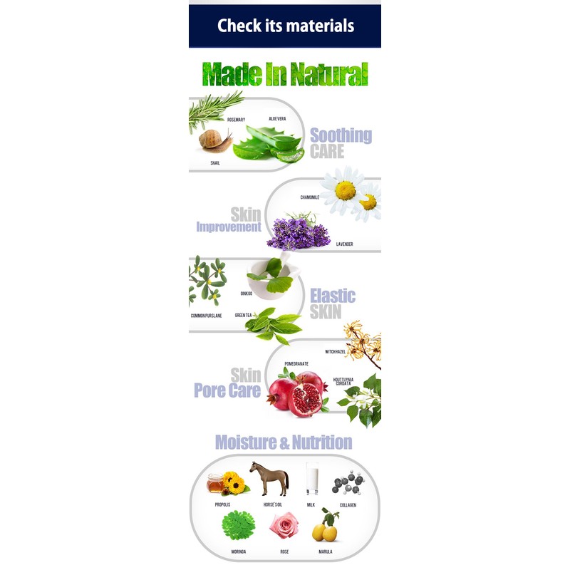 - 45 kinds of nature based extracts - Aloe vera, Rosemary, Snail, Chamomile, Lavender, Green Tea, Wichhazel, Pomegranate etc.