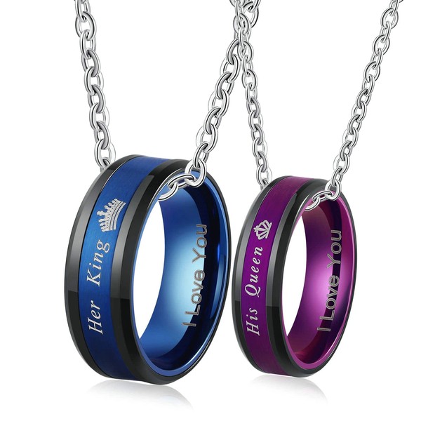 Ayoiow Matching Necklace for Couples, I Love You Ring Necklaces His & Her Crown Couples Necklace "Her King/His Queen"
